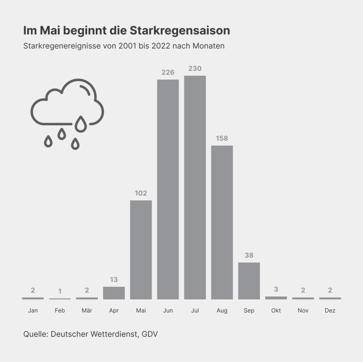 Der Wonnemonat Mai bringt nicht nur viel Sonne, sondern markiert auch den Start der Starkregensaison. Hausbesitzer schauen in dieser Zeit einmal mehr an den Himmel, ob Wetterextreme ihr Hab und Gut gefährden. Und die Zahlen weisen darauf hin: Allein im Juni und Juli gibt es laut Wetterdienst regelmäßig über 200 Starkregenereignisse pro Monat. Sintflutartige Regenfälle sorgen dann für überflutete Keller, beschädigte Gebäude und immense finanzielle Schäden.